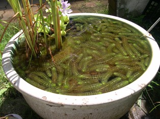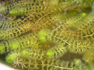 ミジンコをムジナモが捕獲・消化することはやはり生育面から見ても有効のようです。まず、ミジンコの増殖法ですが、昔ながらのミジンコ培養方法では鶏糞を少量水に溶かしたり、藁を水に投入して煮出す方法もあります。最近では、金魚の餌を水に溶かして日光にあててミジンコの餌作りをするようです。これで水は緑色の藻が発生して緑色を呈します。あとは、ミジンコを沼地から捕まえてきてミジンコ培養液に投入すれば自然増殖します。