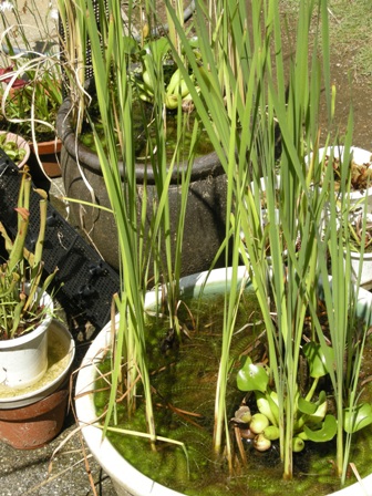 手前の水鉢は抽水植物がコガマ、浮遊植物がホテイアオイ。![]()