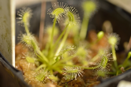 モウセンゴケ(Drosera rotundifolia)は日本国内の食虫植物の自生地で一番見かける品種ではないかと思います。本種の栽培は自生地でよく見かける割には難しいという声を聞きます。主に夏越しが難しいというのが理由と思いますが、あまり栽培方法について詳しく紹介しているサイトも少ないのが現状です。我が家ではモウセンゴケを何年も栽培、増殖しているので一定程度の栽培ノウハウが蓄積出来てきたと思っています。我が家での栽培方法について紹介してみます。