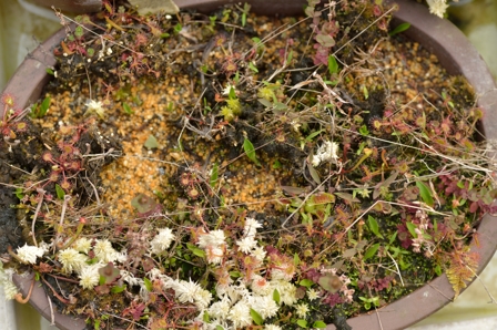 株が育ってくれば、6月ごろ開花します。花径が5ミリに届くかどうかの小さな白い花を咲かせます。花だけ見ていると山野草感たっぷりです。モウセンゴケは種子で更新するのが基本になります。葉挿しも出来るようですが試したことがありません。7月ごろ花茎には種子を入れた鞘がいくつも付いていますので、種がこぼれない内に収穫します。種子は冬に播種するまで保管します。播種は1月頃、水苔にばら蒔きます。